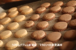 午後はマカロン。前は家で復習したらヒビがはいって失敗したのですが、今回はイタリアンメレンゲ製法とフレンチメレンゲ製法とも、つるピカ&ピエしっかりの